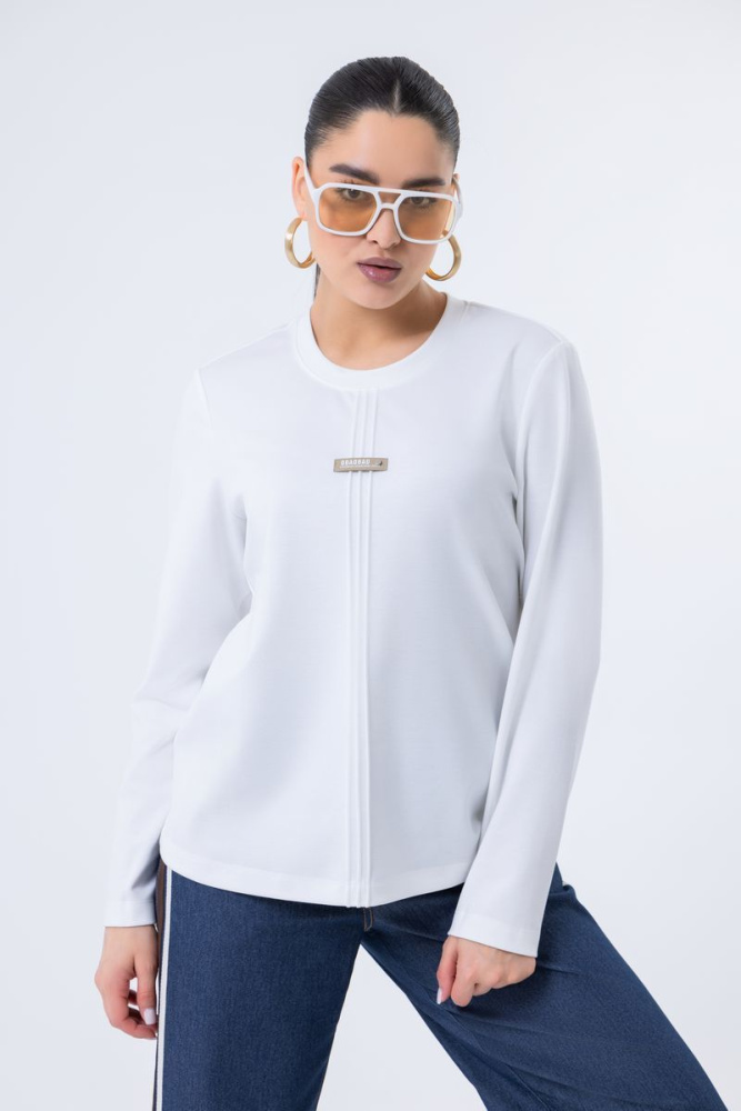 Модель полуприлегающего силуэта выполнена из трикотажного полотна. Полочка свитшота украшена декоративными складками. Вырез горловины круглый. Рукав втачной, длинный. В боковых швах — разрезы.