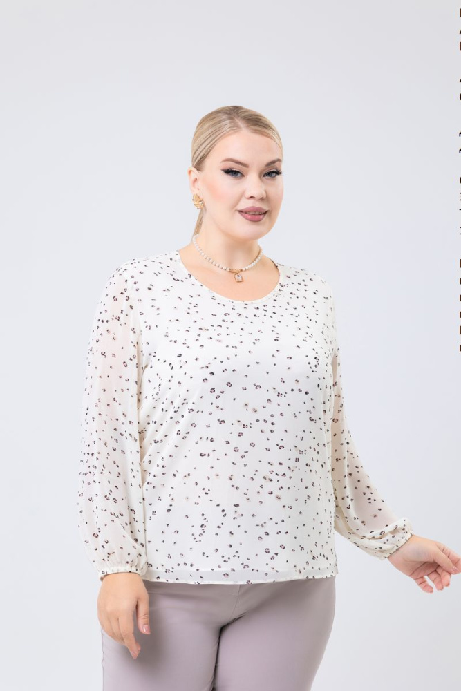 Модель прямого силуэта выполнена из шифона. Круглый вырез горловины. Рукав втачной, длинный. Низ присборен на резинку. Изделие на подкладке.