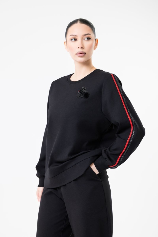 Свитшот прямого силуэта выполнен из трикотажного полотна. Вырез горловины. Рукав втачной, низ на резинке. По центру полочки нашивка «Заяц». По низу изделия — планка.