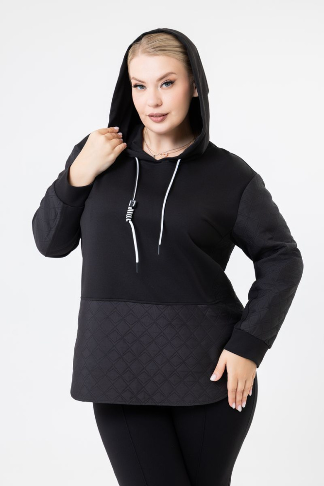 Модель силуэта «трапеция» выполнена из двух видов ткани: плательная молочная ткань («стёжка») + трикотаж. Изделие с капюшоном. Вырез горловины круглый. Спущенная линия плеча. Рукав длинный. Низ свитшота фигурный. В боковых швах небольшие разрезы.