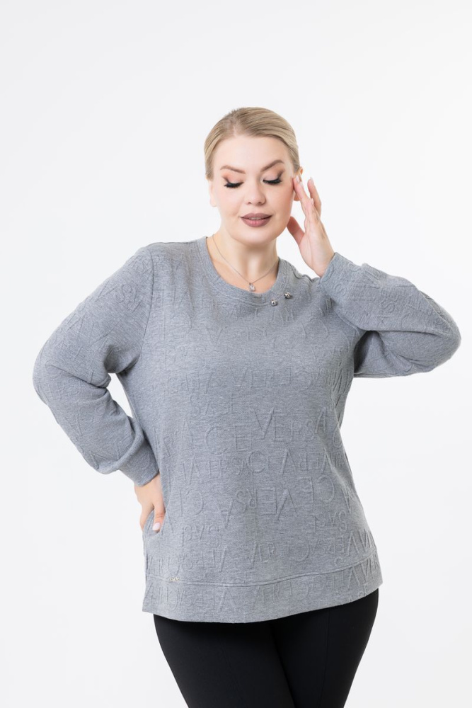 Свитшот прямого силуэта выполнен из трикотажного полотна. Вырез горловины круглый. Рукав втачной длинный. Низ изделия и рукавов на манжете. В боковых швах — разрезы.