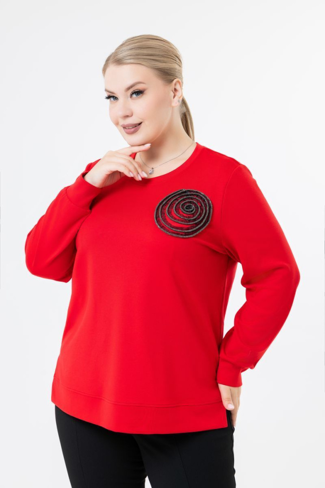 Свитшот прямого силуэта выполнен из трикотажного полотна. Круглый вырез горловины. Длинный рукав. Низ рукавов и изделия на манжете. Модель дополнена декоративной нашивкой. В боковых швах внизу разрезы.
