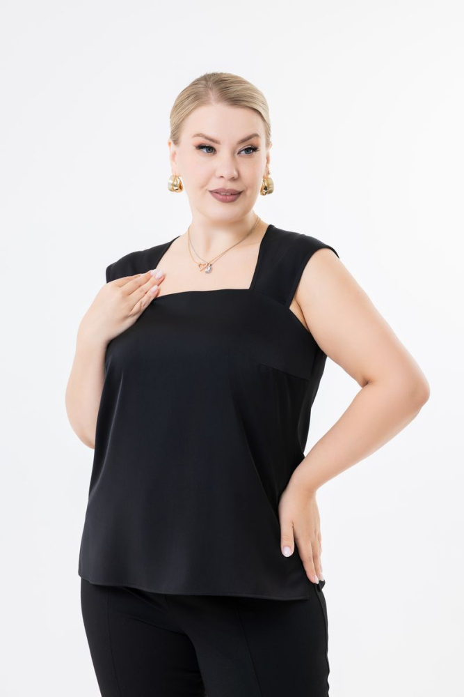 Модель на широких лямках прямого силуэта выполнена из японского шёлка. Вырез горловины каре. Внизу в боковых швах разрезы.