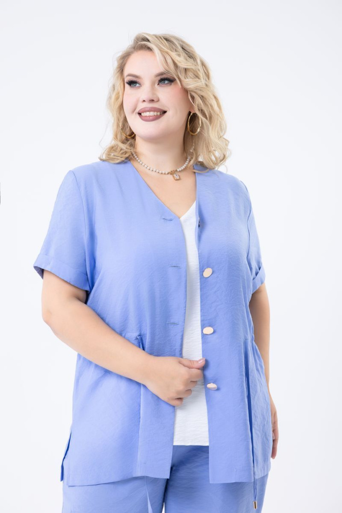 Блузон прямого силуэта выполнен из ткани «Queen-тока». Вырез горловины круглый. Рукав втачной, короткий, на манжете. По центру полочки застёжка на пуговицы. По линии талии — «кулиска». В боковых швах внизу — разрезы.