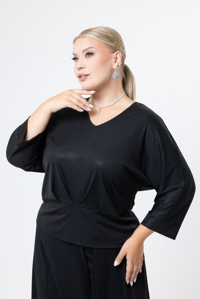 Модель полуприлегающего силуэта выполнена из трикотажного полотна («масло») с напылением. Вырез горловины V-образный. Рукав цельнокроеный, длинный, низ на манжете. По центру полочки заложены складки. Низ изделия оформлен широкой манжетой.