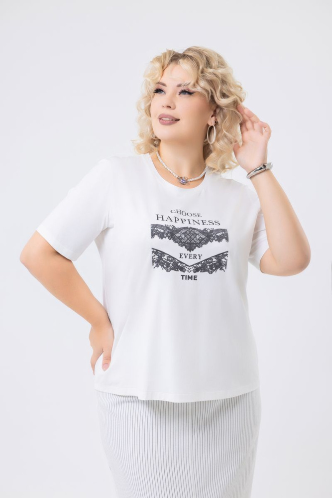 Изделие свободного кроя выполнено из ткани «Модал». Вырез горловины круглый. Рукав втачной, короткий. По полочке — печать.