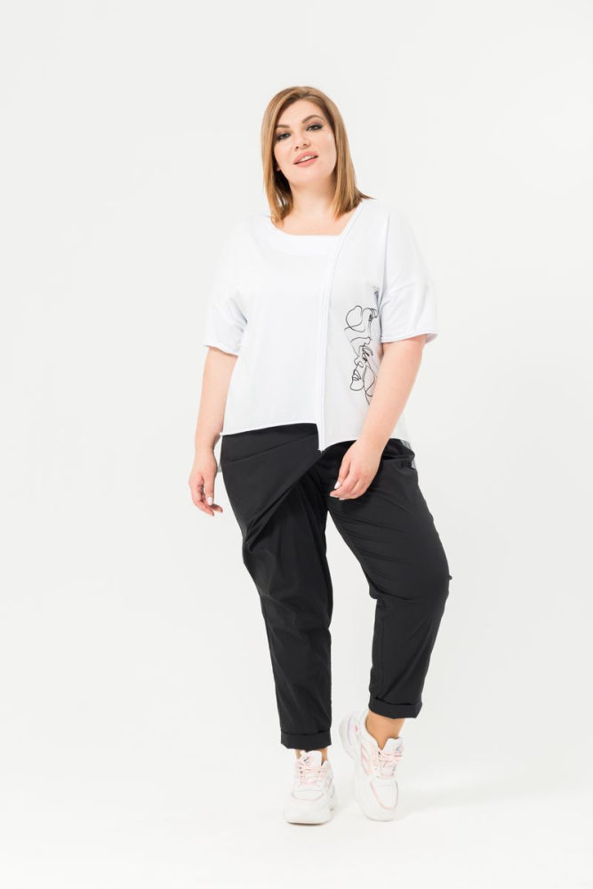 Брюки бананы выполнены из хлопковой ткани. Пояс на резинке. В области линии бёдер - драпировка. Низ изделия на манжете. Имеются 2 действующих кармана