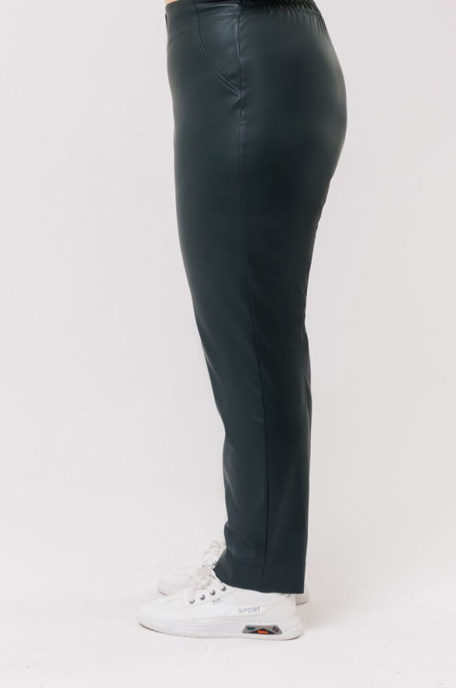 Прямые брюки выполнены из экокожи. Пояс по переду фиксированный, по спинке на резинке. По полочкам - «подрезы» и имитация застёжки «гульфик».