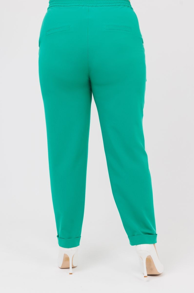 Брюки выполнены из ткани « Гальяно ».Пояс по кругу на резинке со шнурком. Низ изделия на манжете. На задних половинках « листочки ».