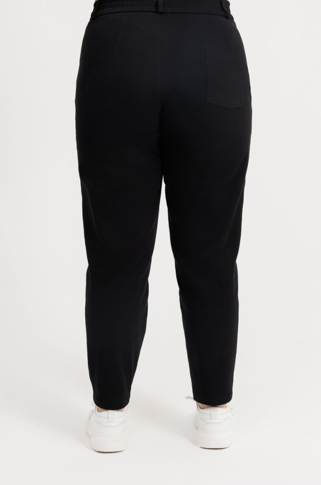 Брюки выполнены из джинсовой ткани. Пояс по переду фиксированный, по спинке - на резинке.
