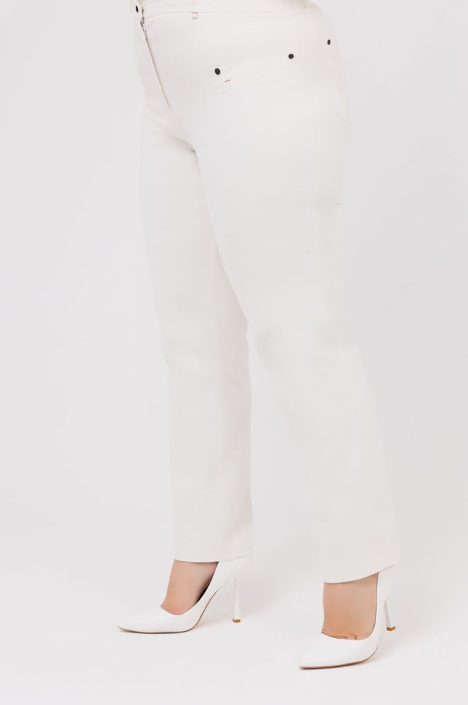 Брюки выполнены из джинсовой ткани. Пояс по переду фиксированный, по спинке на резинке. передним половинкам - декоративные детали. По задним - накладные действующие карманы. Застёжка на молнию и крючок.