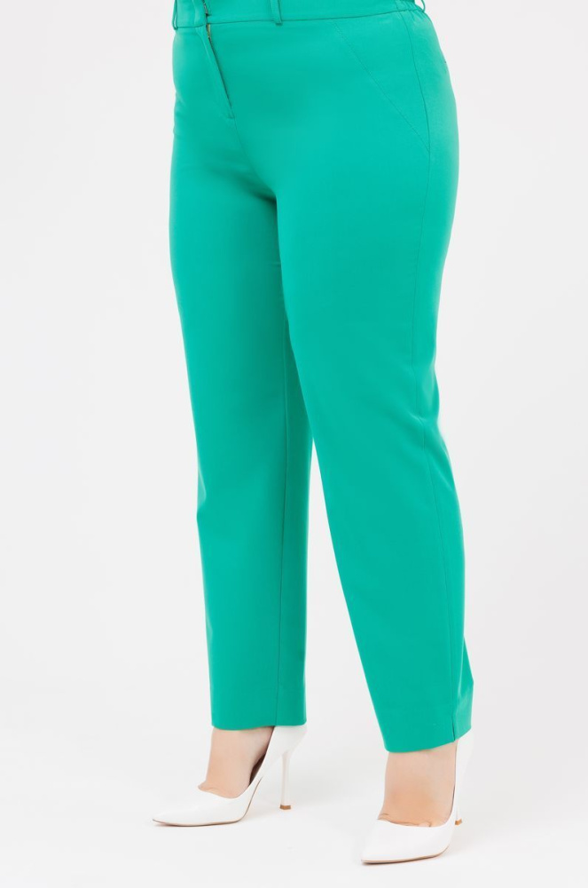 Брюки прямые, слегка зауженные книзу, выполнены из ткани «Гальяно». Пояс по переду фиксированный, по спинке на резинке. По передним половинкам «подрезы» и застёжка на молнию и крючок. По задним - «листочки». В боковых швах, внизу, небольшие разрезы.