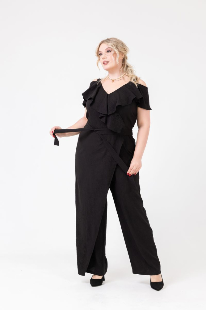 Комбинезон выполнен из ткани «Roder» V - образный вырез горловины В верхней части изделия - волан Линия талии — отрезная Брюки прямые с отлетной деталью Пояс фиксированный, по бокам на резинке.