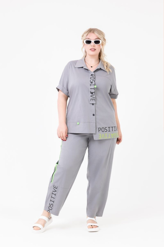Широкие брюки слегка зауженные к низу. Правый бок декорирован цветной тесьмой и печатью по низу брюк. Пояс на резинке. Имеются 2 действующих кармана.