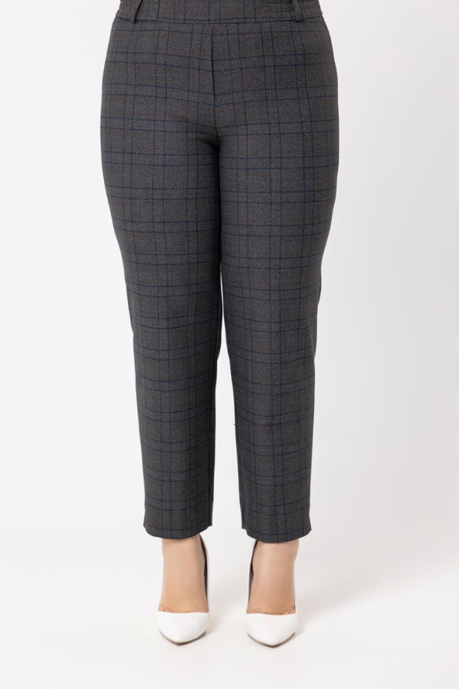 Модель, слегка зауженная книзу выполнена из костюмной ткани. Пояс на резинке. По передним половинкам декоративный гульфик. В боковых швах, внизу, не большие разрезы. Без карманов.