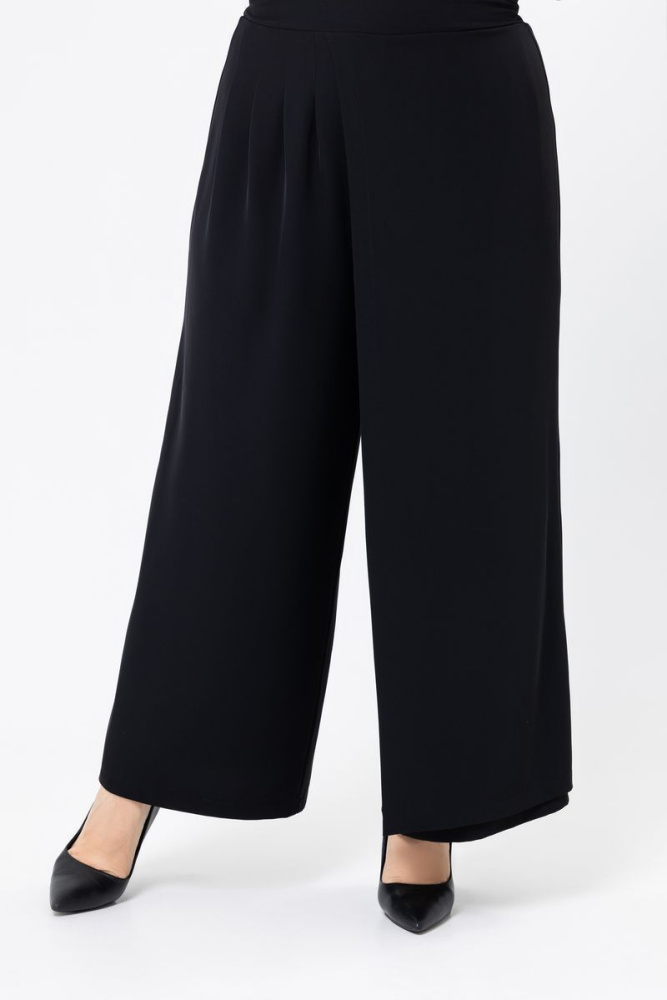 Брюки выполнены из ткани «Versace». Пояс по переду фиксирован, по спинке на резинке. На передних половинках отрезная кокетка с защипами и отлетная деталь.