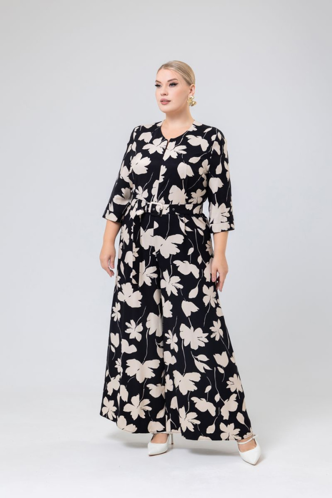 Комбинезон выполнен из ткани «Маракен». Вырез горловины V-образный. Рукав втачной. Низ оформлен на манжету. Длина рукава за локоть. По центру застёжка на потайную молнию. По полочке рельефы, переходящие в складки. Брюки — «трубы». Карманов нет. К изделию прилагается съёмный пояс из основной ткани.