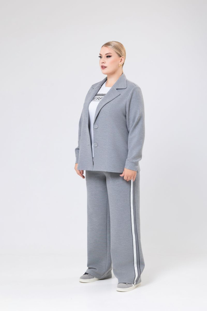 Брюки прямые от бедра выполнены из трикотажного полотна. Пояс на резинке с декоративным шнурком. По боковым швам лампасы и действующие карманы.