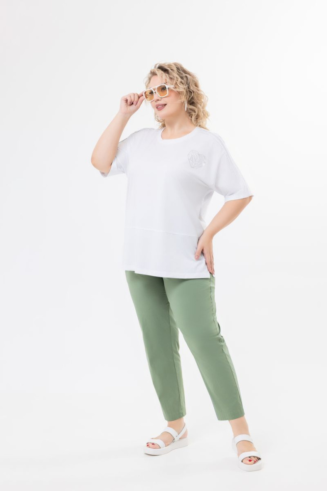 Полуприлегающие брюки выполнены из хлопка. Пояс на резинке. По передним половинкам декоративный «гульфик». Имеются два действующих кармана.