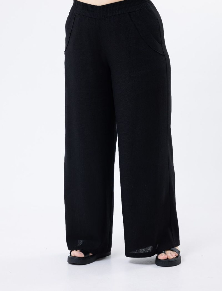 Брюки «Трубы» выполнены из льняной ткани. Пояс на резинке. Имеются 2 действующих кармана.