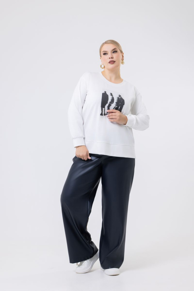 Брюки выполнены из экокожи. Пояс по переду фиксированный, по спинке на резинке. По передним половинкам подрезы и застежка на молнию и пуговицу.