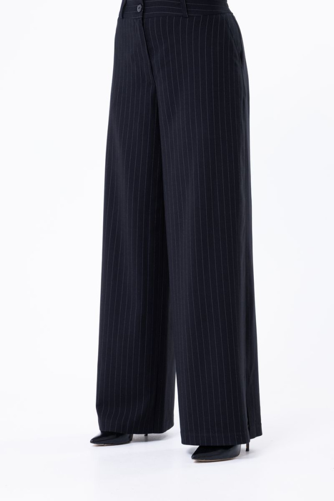 Брюки «Трубы» выполнены из костюмной ткани. Пояс по переду фиксированный, по спинке — на резинке. Застёжка на молнию и пуговицу. Имеются два действующих кармана. В боковых швах — небольшие разрезы. На задних половинках — «клапан».