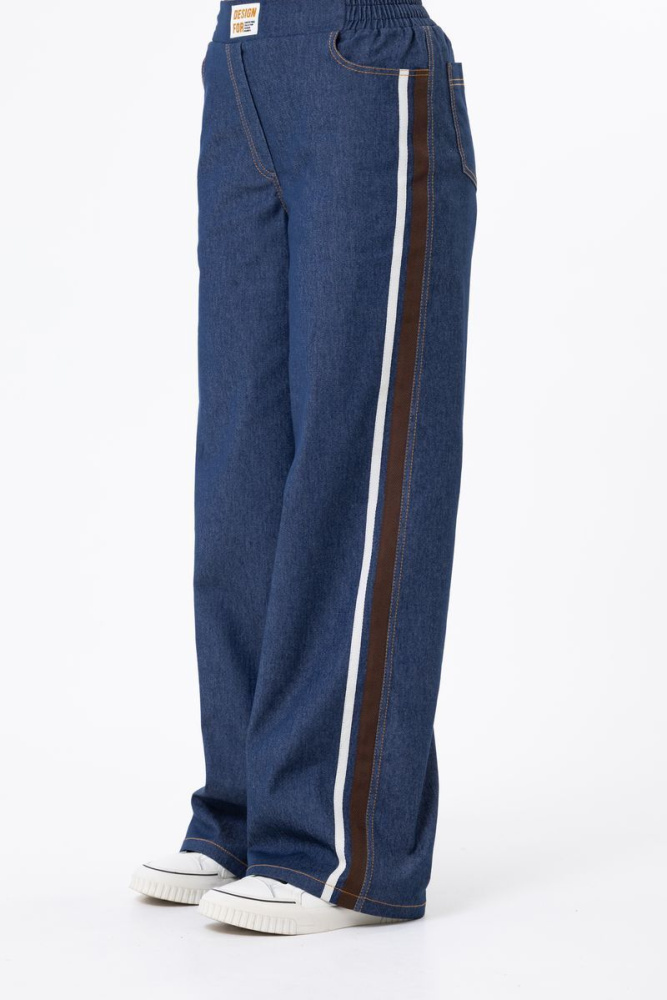 Брюки «трубы» выполнены из джинсовой ткани. Притачной пояс, по спинке — на резинке. Имитация гульфика. Карманы действующие. Изделие украшено лампасами.