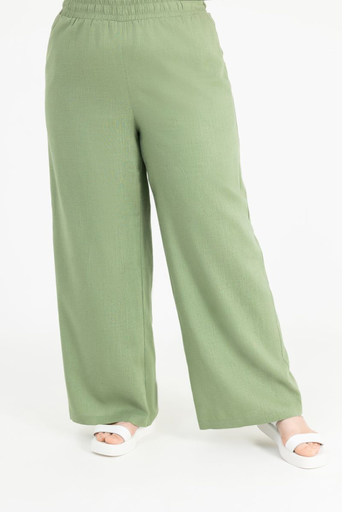 Брюки прямого силуэта выполнены из льняной ткани. Пояс на резинке. Имеются два действующих кармана.