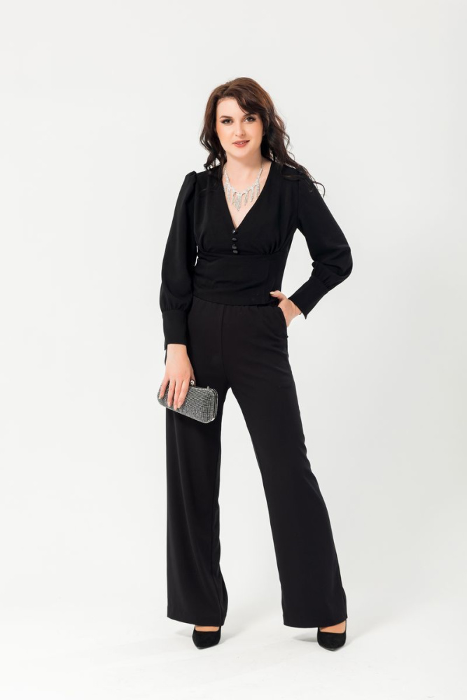 Прямые брюки выполнены из ткани «Мурано». Пояс на резинке. По переду два действующих кармана.
