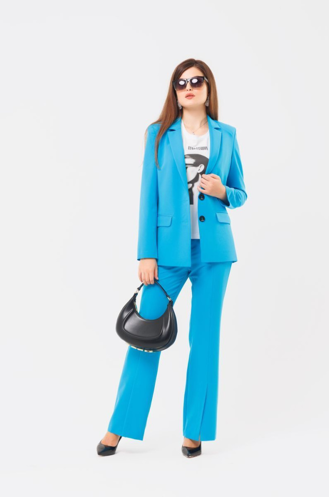 Брюки выполнены из ткани «Гальяно». Пояс фиксированный. По передним половинкам, внизу, разрезы.