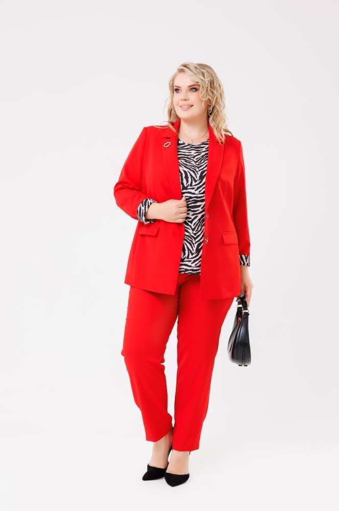 Комплект (жакет + брюки) выполнен из ткани «Морчано». Жакет прямого силуэта. Отложной воротник с лацканами. Рукав втачной, длинный. Имеются два действующих кармана с «лацканами». Модель на подкладке с дизайнерским принтом. По центру полочки застёжка на пуговицы. Модель дополнена плечевыми накладками.