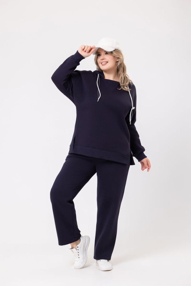 Комплект (толстовка + брюки) выполнен из ткани футер флис Изделие с капюшоном. Спущенная линия плеча. Рукав длинный. В боковых швах, внизу, не большие разрезы. Низ изделия и рукавов на манжете.