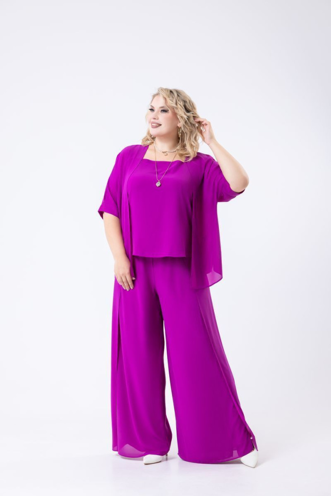 Комплект (накидка + брюки + топ) выполнен из шифона. Накидка свободного силуэта. Спущенная линия плеча. В боковых швах разрезы. Без застёжки.