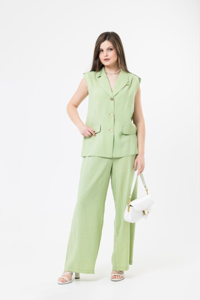 Комплект (жилет+ брюки) выполнен из ткани «Queen Moka» с небольшим эффектом крэш. Жилет полуприлегающего силуэта. Отложной воротник с декоративной деталью и лацканами. В верхней части изделия расположены «паты». По плечевому шву заложены складки. По полочке «клапаны» и застёжка на пуговицы. По спинке средний шов. Брюки прямые. Пояс на резинке. Карманов НЕТ.