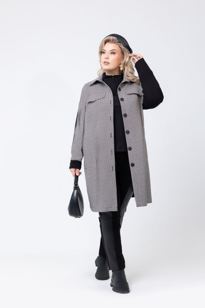 Кардиган свободного силуэта выполнен из трикотажного полотна двух видов : чёрный ( спинка ) + гусиная лапка ( полочка ). Отложной воротник. Рукава втачные, длинные, оформлены на манжету. По полочке , в верхней части изделия, два « клапана ».