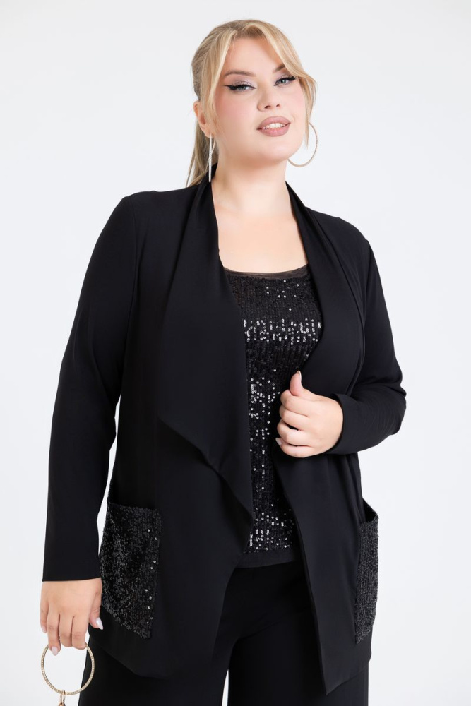 Жакет прямого силуэта выполнен из французского трикотажного полотна. Стояче-отложной воротник с удлиненными лацканами. Рукава втачные, длинные. По полочке два действующих кармана из ткани с пайетками. Модель без застёжки и без подкладки.