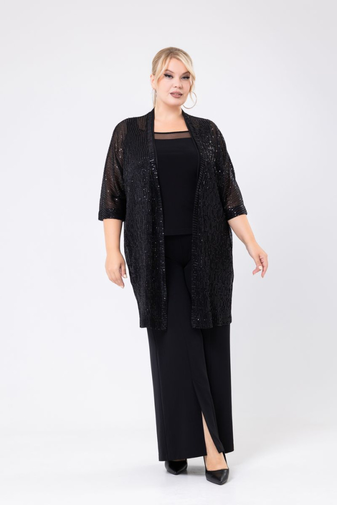 Жакет свободного силуэта выполнен из трикотажного полотна с пайетками. Вырез горловины V- образный. Рукав цельнокроенный, длина за локоть, низ на манжете. Модель без покладки, без пояса и пуговиц.