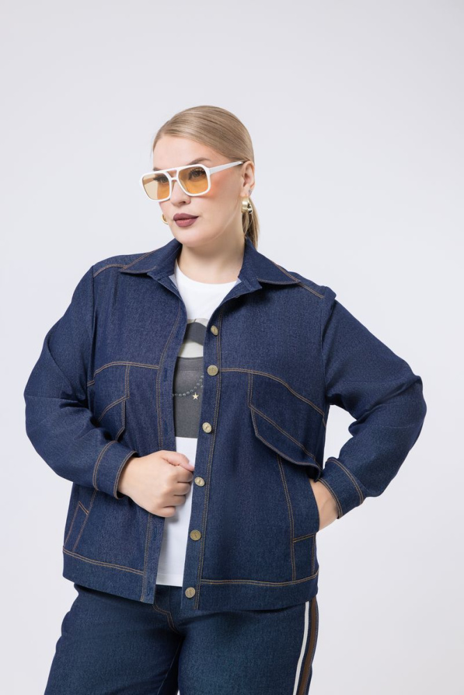 Куртка прямого силуэта выполнена из джинсовой ткани. Рубашечный воротник. Рукав втачной, длинный. По полочке «кокетка», клапаны. По центру застёжка на пуговицы. По спинке «кокетка» и средний шов. Низ изделия и рукавов на манжете.