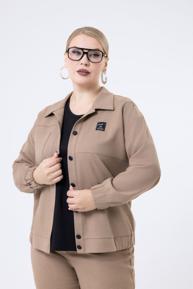 Бомбер прямого силуэта, выполнен из костюмной ткани. Линия плеча спущенная. Рукав длинный, на манжете. Центральная застежка на пуговицы.