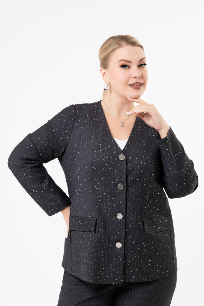 Жакет полуприлегающего силуэта выполнен из костюмной ткани с металлическим напылением. Воротник V-образный. Рукав втачной. По переду центральная застёжка на пуговицы и «клапаны». Изделие без подкладки.