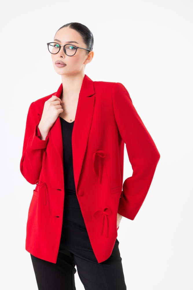 Жакет полуприлегающего силуэта выполнен из ткани креп Tommy. Отложной воротник с лацканами. По полочкам декоративное украшение «бантики». Имеются действующие карманы.