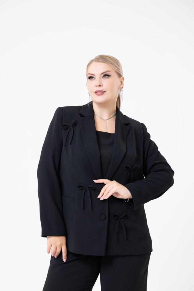 Жакет прямого силуэта выполнен из ткани Tommy. Отложной воротник с лацканами. Рукав втачной, длинный. По полочке расположены декоративные бантики. Имеются рабочие карманы. Изделие на подкладке. Модель дополнена плечевыми накладками.