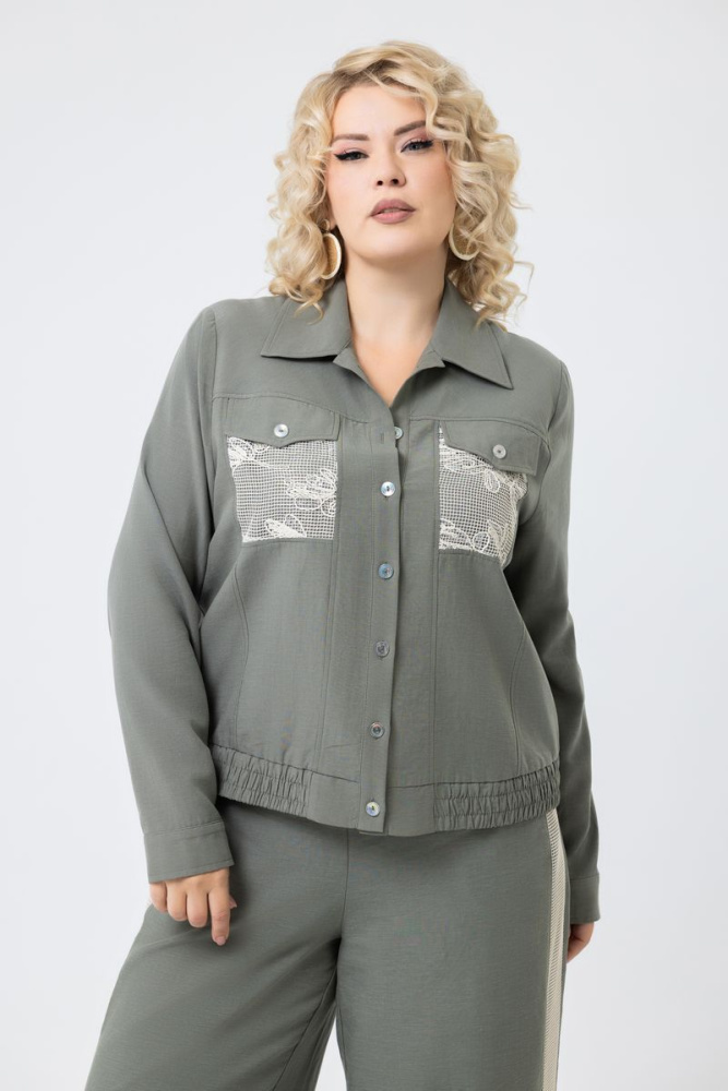 Изделие выполнено из ткани лён-тенсель Akamaka. Воротник отложной. Рукава втачные, длинные, на манжете. По полочке клапаны. По спинке кокетка. По переду и спинке украшение из кружева с пайетками. Низ бомбера на широкой резинке.