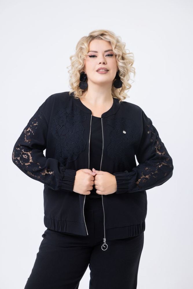 Бомбер прямого силуэта выполнен из джинсовой ткани. Круглый вырез горловины обработан планкой. Рукав втачной, длинный, с гипюровой вставкой по центру. Верхняя часть куртки дополнена декоративными элементами из чёрного гипюра. По центру застёжка на молнию. Имеются действующие карманы. Низ изделия и рукавов на резинке.