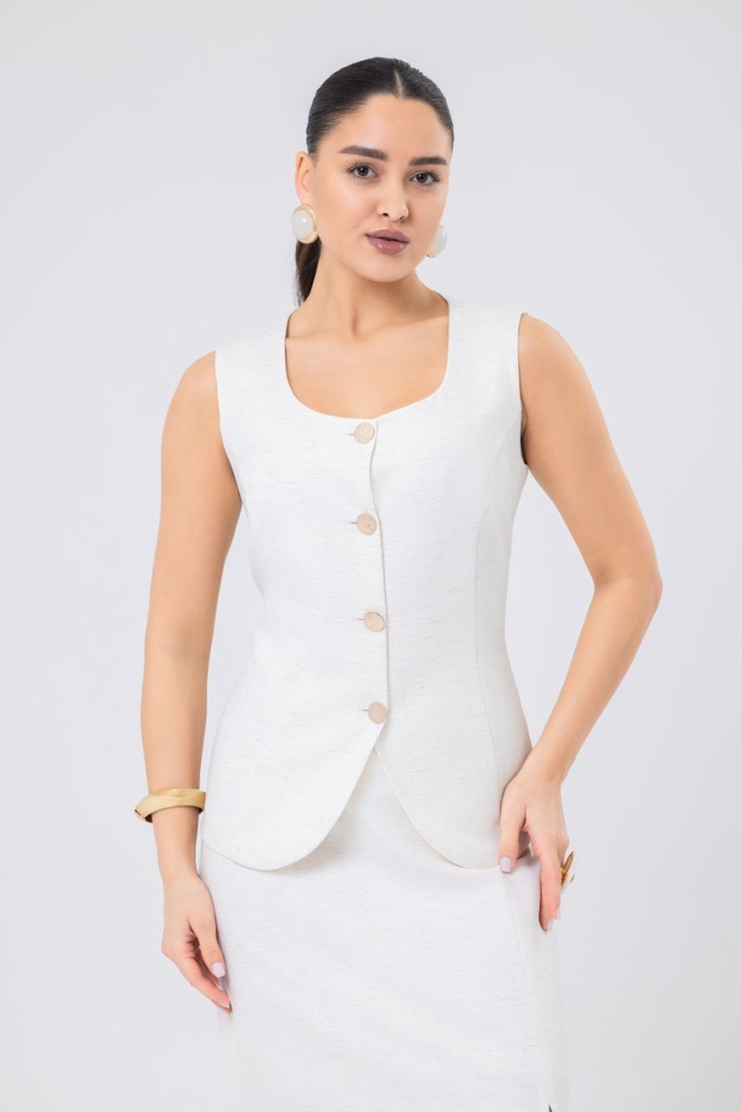 Изделие прилегающего силуэта выполнено из льняной ткани. Круглый вырез горловины. По полочкам рельефы. По центру застёжка на петли и пуговицы.