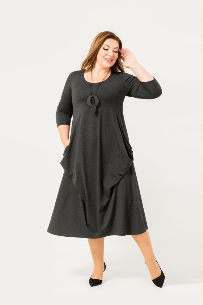 Рукав втачной, 3/4. Имеются два действующих кармана. По спинке средний шов. Платье дополнено украшением.