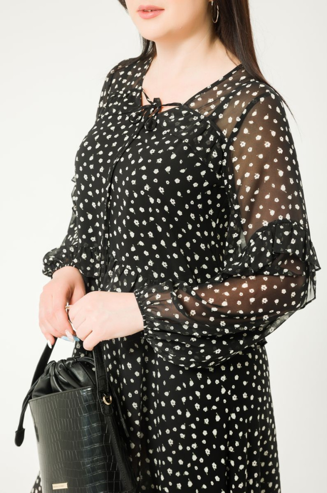 Модель силуэта "трапеция" выполнена из шифона. Вырез горловины круглый. Рукав втачной, длинный, низ на резинке. В области талии и по рукавам - рюша.Изделие дополнено платьем-чехлом