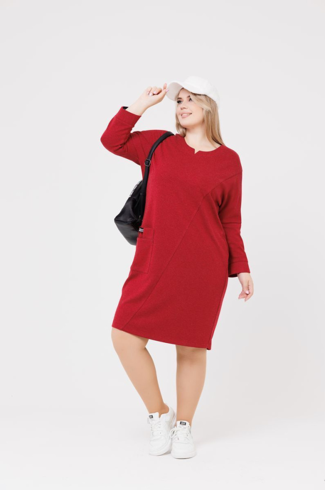Модель прямого силуэта выполнена из трикотажного полотна. Круглая горловина с небольшим V- образным вырезом. Спущенная линия плеча. По полочке рельеф и действующий карман.