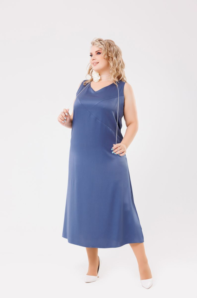 Модель полуприлегающего силуэта выполнена из атласа. Вырез горловины V- образный. По полочке - рельефы. В боковых швах, внизу - разрезы. По спинке серединный шов.