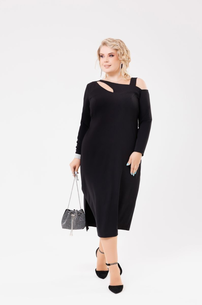 Модель прилегающего силуэта выполнена из ткани "Scarlett". Асимметричный вырез горловины и рукава. Втачной, длинный рукав. По спинке средний шов и талиевые вытачки. В боковом шве - разрез. Изделие на подкладке.